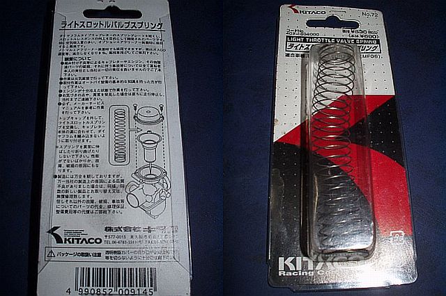 ボアxストローク:65.5×66.2(223cc) 圧 縮 比:9.0 最 高 出 力:16ps/7,000rpm 最大トルク :1.8kg-m/5,500rpm 燃料タンク容量:7.2L ほぼスクウェアに近いロングストローク型で、ちょっと気になるのが圧縮比が少々低いですね。 パワーを出すのならば、10.0:1超は欲しい所なのですが・・・。 もっともタケガワからハイコンプピストンが出ています。(11.4:1に上がりますv) ハイカムもラインナップにありますけど、実はXR200のカムもプチハイカムとして流用が出来るのです。 プロファイル的には、FTR223<XR200<タケガワとなります。 もっとも、こんな本格的に改造をするにはコストも掛かりますし、耐久性がスポイルされますので ここは「付いている物を活かしつつ、費用対効果を鑑みて」といういつもの手法で行います。 実は、このバイクが入庫した時点ですぐにマフラーとキャブのセッティングを行って バタバタサウンドだけではなく、アクセルをひねった時の瞬発力を良くしてあります。 もちょっとレスポンスが良くなると、もっと楽しく乗れそうですね。 そして、とっても良いパーツを見つけてしまいましたv キタコから出ている、「ライトスロットルバルブスプリング」402-180600/\630-。 ※写真の商品です。但し中身は交換済みのノーマルSPですよ。 これは、負圧サーボ型のキャブ用のパーツで、純正エアクリーナー→パワフィルにした時向けとのことです。 そもそも、このスプリングレートを変更すればフィーリングが良くなると言う物ではありませんが、 負圧サーボキャブの機能上、吸気側の抵抗が大幅に変わる改造をした場合には、燃料の濃さ(ジェット類)だけのセッティング変更では なかなか調子が良くなりません。 FTRはマフラーとパワフィルへの改造が主流となっているので、それに応じたパーツって事です。 (対応車種は、FTR223,FORZA/S[MF06]) 本来の私の手法では、大抵ダイノジェットキットを採用するんですけど 現在入手が困難なのと(大手部品流通業者が手を引いているようです)、 やはり値段の点で、到底キタコのには適わないので今回は見送りました。 本音を言えば、そこまで良くしてどーすんの、もっと手軽に気軽にって気持ちもありましたけどねv