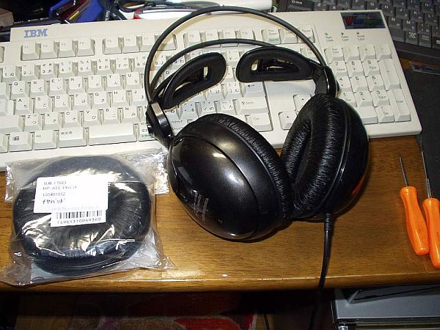 装着感がとても良い反面、この大きなイヤーパッドってのは寿命が短いんです。 ある程度の年月使っていると、表面が剥がれて来てしまうんですね。 なので、スペアのイヤーパッドを購入してあります。 (2つ購入し、交換して1つ予備がある。写真にも写っていますね) スペアのイヤーパッドは、\1,250-します。 この手の補修部品とか買う時は、通信販売を利用することが多いです。 ココとか→サウンドハウスのサイト もっとも、通販には魔力が潜んでおり、「どうせ送料が掛かるんだから」と余計な物まで買い込んでしまいがちなんですv なので2つイヤーパッドを買った、のかも知れませんね。 よくよく考えてみると、このヘッドホンも既にある程度使ったんだからモトは取れている訳で、 不具合が起こった時点で「上位機種への買い替え」を検討しても良いんですよ。 しかし、「スピーカーやヘッドホンの音質は、値段に比例する」という原則はあるのですが、 ヘッドホンの場合はそれぞれの製品に個性がありますんで、上位機種が必ずしも上回るとは限りません。 なので、使ってみて気に入った製品はなるべく長く使い続けたいんです。 これは昔々、松下のRP-HT250という\29,800-もするヘッドホンを使っててすごくお気に入りだったんですが、 長年の酷使によりドライバが吹っ飛んでしまいました。(片方、鳴らなくなった) この時は補修部品で修理をしたんですが・・・全然、鳴り方が変わってしまったんです。 かなり特性が荒れたので、結局オーディオ事業部さんに相談して対処していただきましたが、製造時でも特性がなかなか揃わなくて苦労しているとの事でした。 これも10年以上使いましたが、最終的にはハウジングまで割れてしまって廃棄することとなりまして、 その後継モデル(つまり松下で一番高いの。値段は3万近くの同じクラス)を迷う事無く買ったんですが・・・音質の違いに唖然としましたね。 全くもってお話になりません。音悪い。1万円クラスにも劣る。 もちろん事業部さんにまた相談したのですが、性能の限界だそうでがっかりしました。 つまりハズレってことでした。 ※以降Panasonicのヘッドホンは購入していません。更にその後継モデルの音質は多少マシにはなったけど。 たぶん、今でもどっかに仕舞ってあるはずなんですが・・・・。 そんなこともありまして、とにかく気に入った機種に巡り合ったんなら大事に長く使うのが良いです。 それと、スペアのイヤーパッドも事前に購入しておきましょう。 ヘッドホンの故障するパターンってのは、踏ん付けて壊す/コードが断線する/イヤーパッドが破れる、が殆どです。 ちなみにイヤーパッドの交換ですが、ある程度手先が器用な方じゃないと出来ない事もありますよ。 オーディオテクニカのこのでっかいヘッドホンは、交換しにくい部類に入ります。 (すでに私のは2回交換しています)